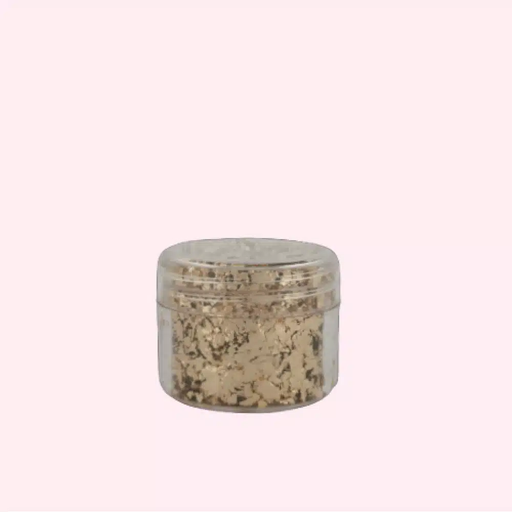 Deze flakes zijn goud van kleur en verpakt in grote potjes zodat jij je niet drukt hoeft te maken of je wel genoeg hebt.