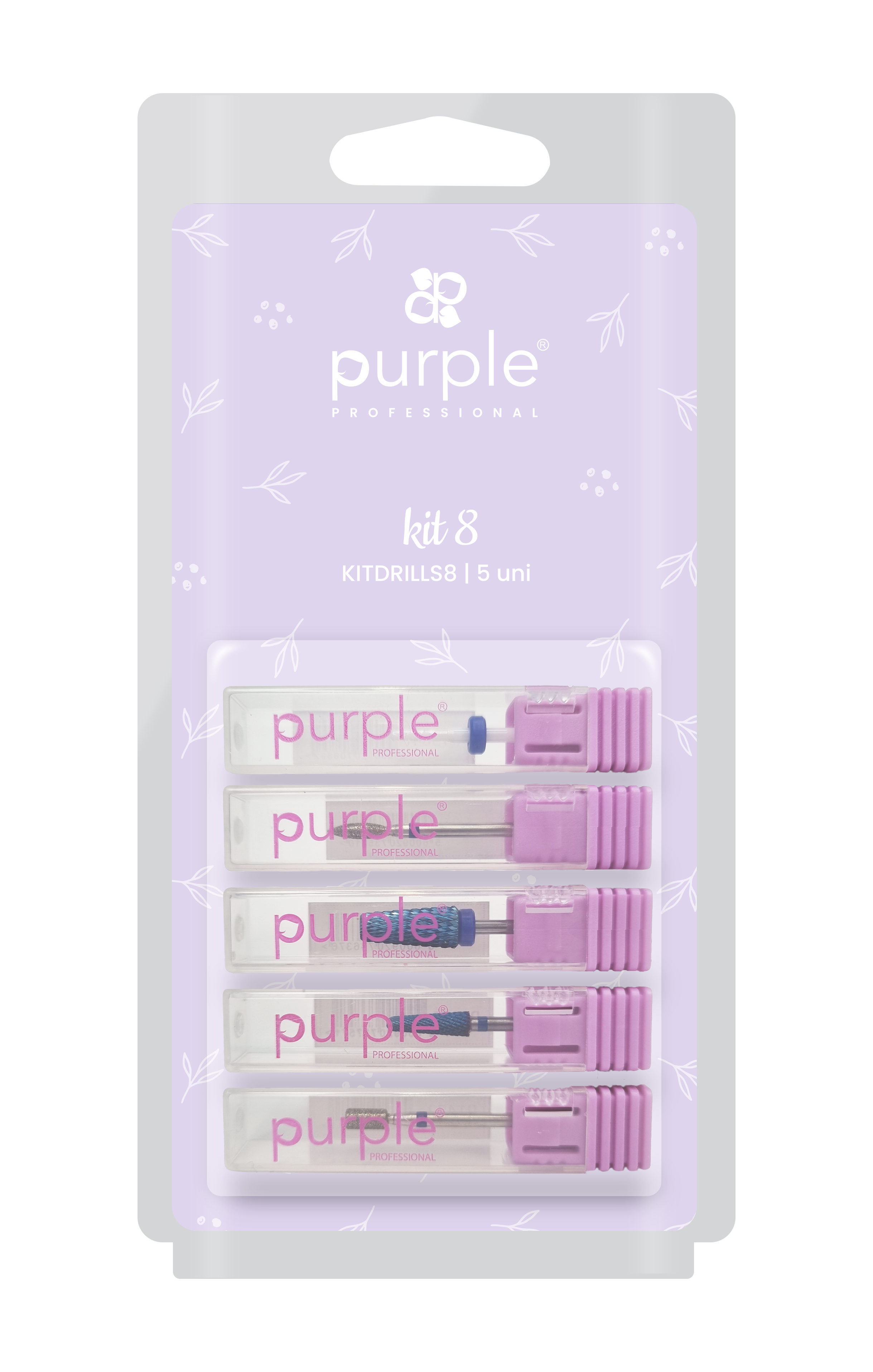 De N°8 Bit set bevat 5 bitjes van het merk Purple Professional, inclusief 1 gratis bitje . In deze complete set vind je 2 bitjes voor het verwijderen en vormen van nagelriemen, evenals 3 bitjes voor het bewerken van nagelriemen. Inhoud van de KIT: –