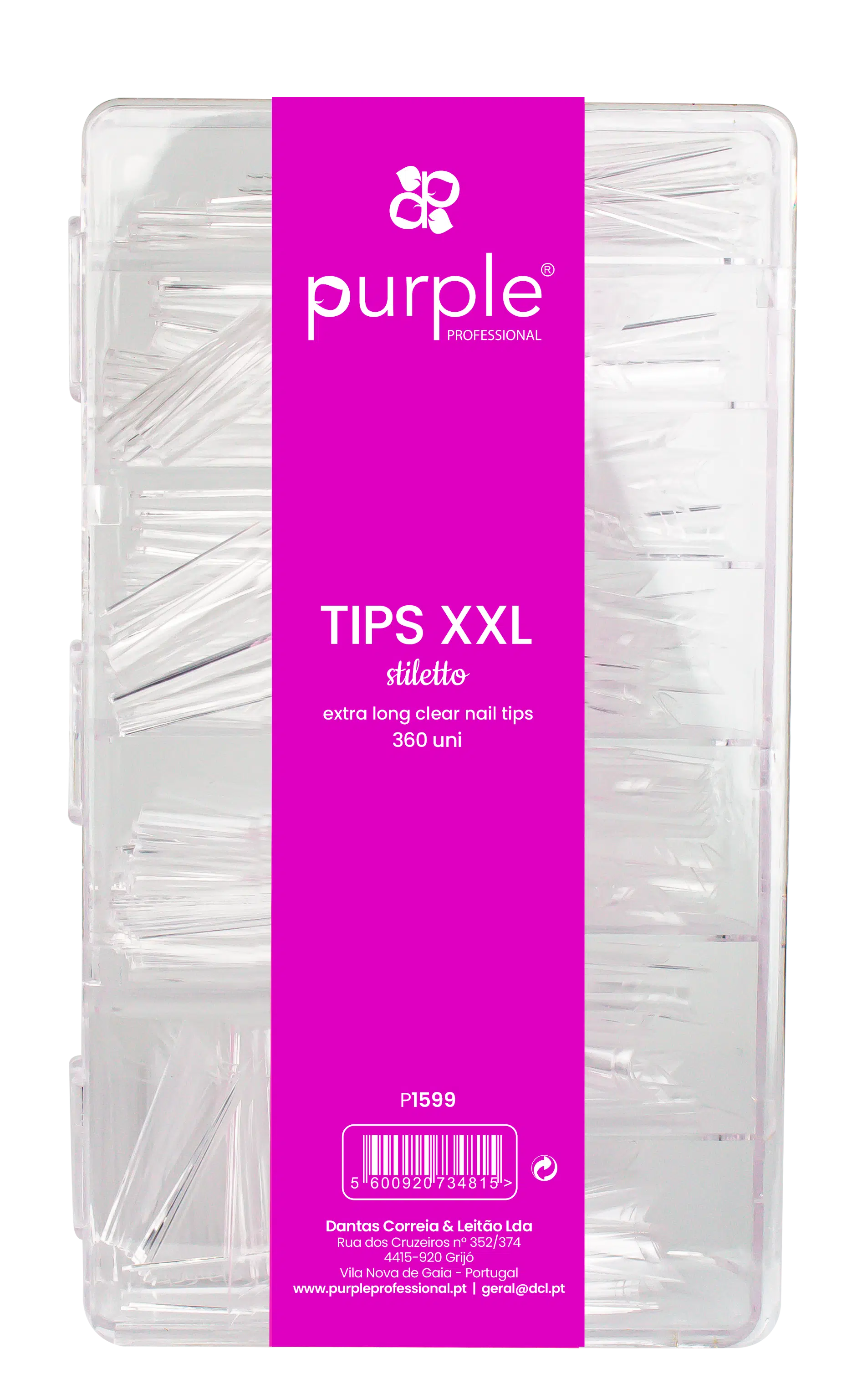 Doos met 360 XXL STILETTO Tips van Purple Professional. Deze extra lange stilettovormige tips zijn ideaal voor het verlengen van de nagels.. Ze zijn gemakkelijk te vijlen, stevig en flexibel. De C-curve van deze tips zorgt voor een natuurlijke uitstraling. Ze zijn transparant van kleur en genummerd van 0 tot en met 11 (12 verschillende maten).