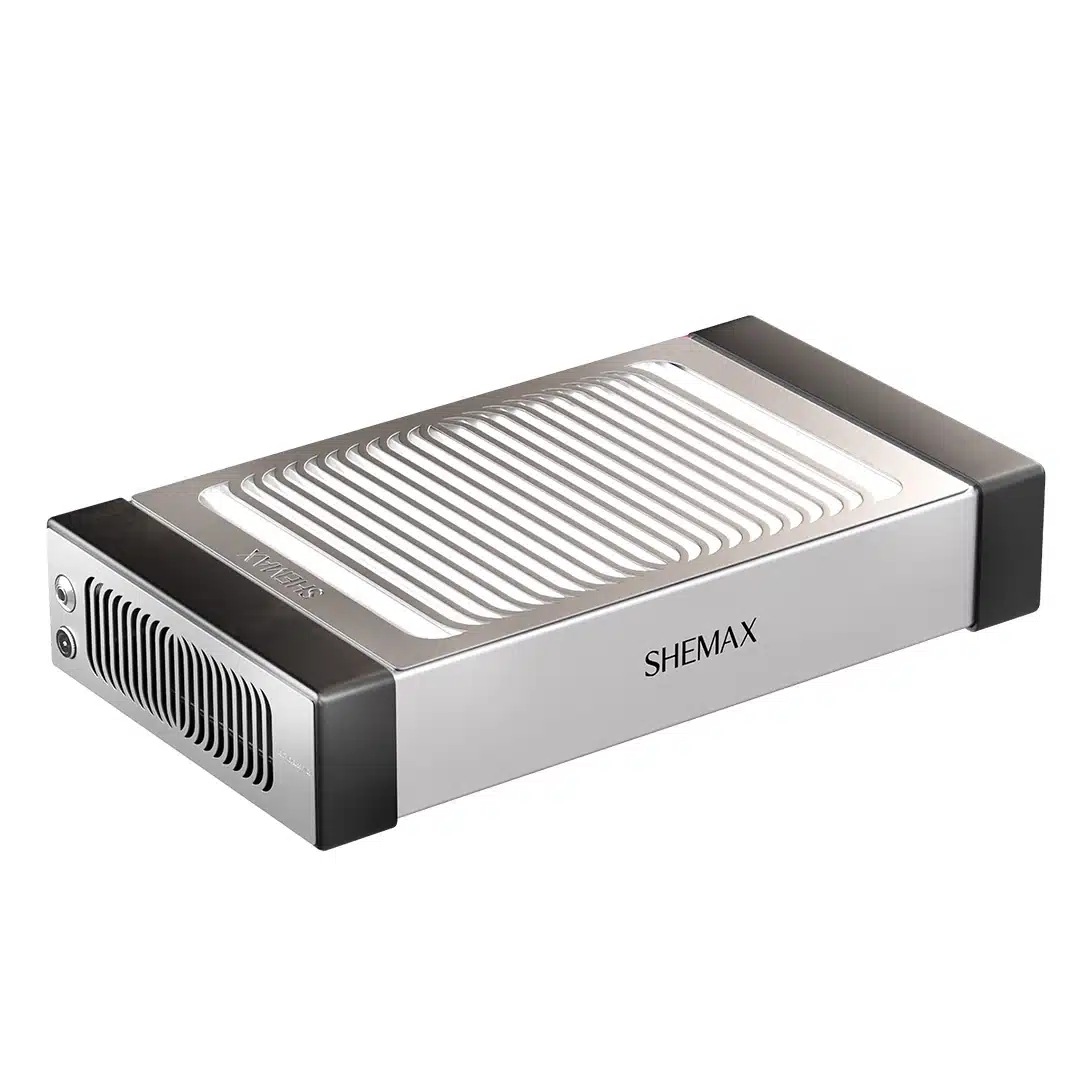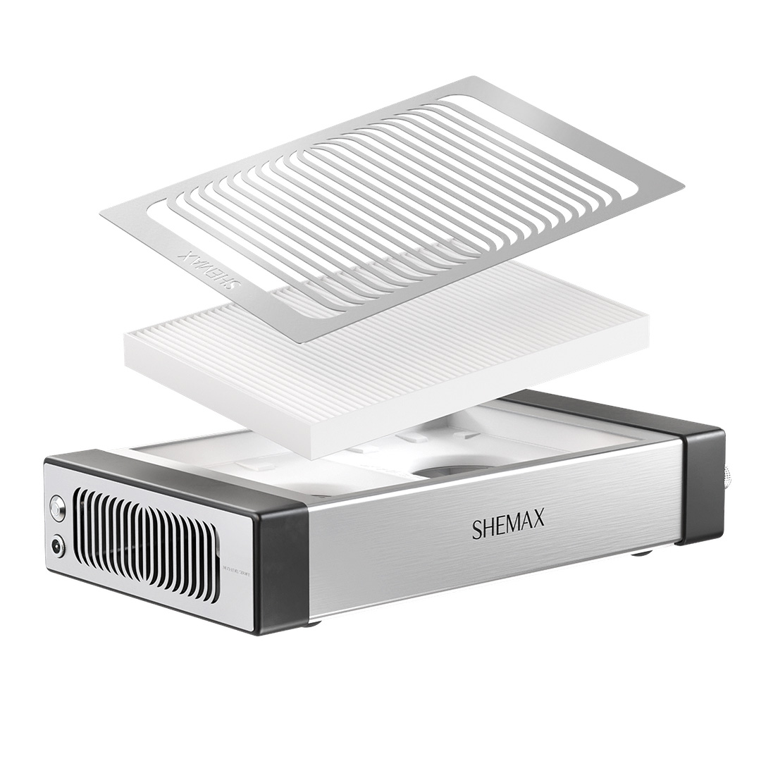 Dankzij een groot opvang oppervlak van 24×17 cm vangt de SHEMAX STYLE PRO het fijnstof op voordat het de lucht in kan vliegen en zicht op voorwerpen kan nestelen. Het manicure stof wat vrij komt wordt onmiddellijk met grote kracht het HEPA-filter ingezogen waar het in het filter wordt samengeperst.