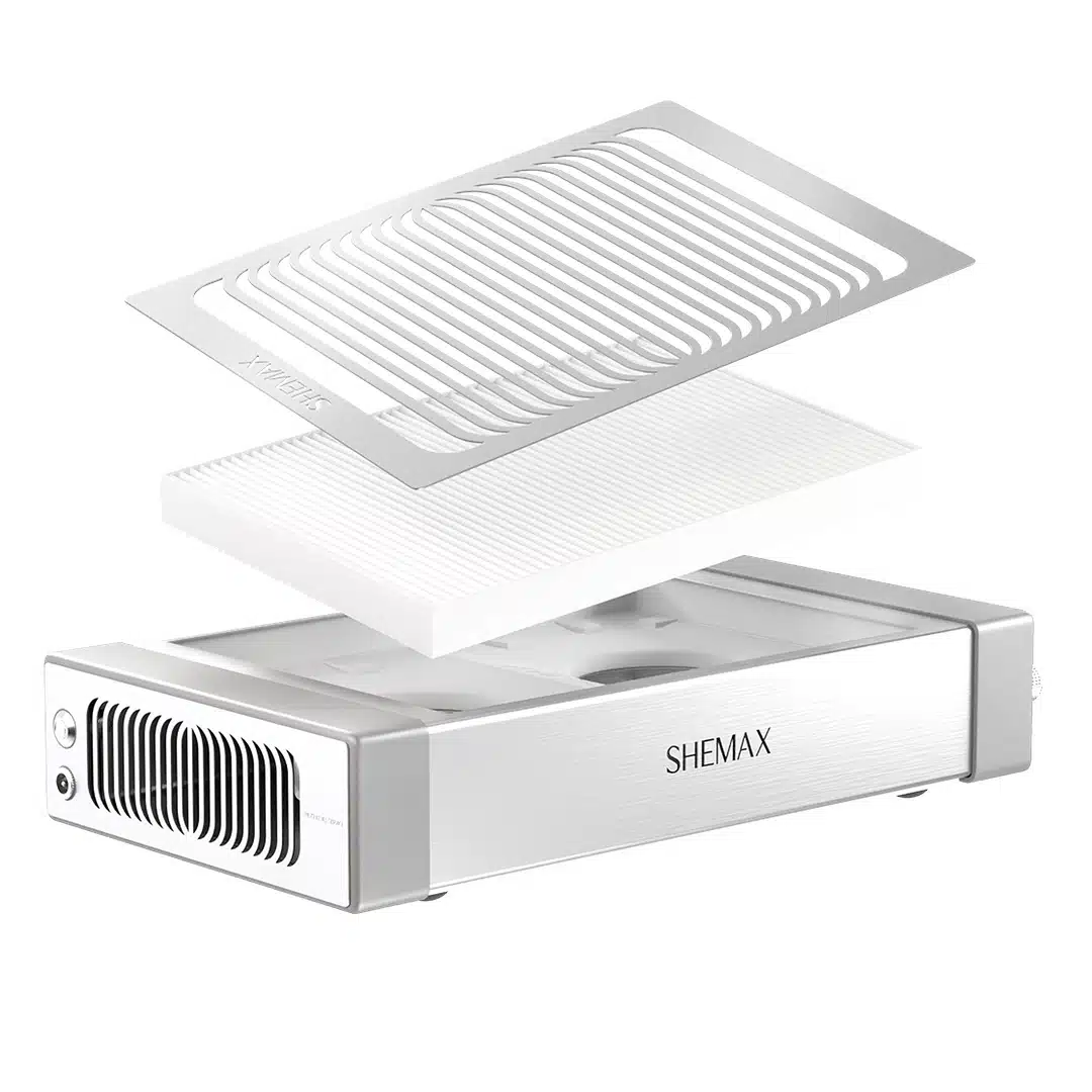 Dankzij een groot opvang oppervlak van 24×17 cm vangt de SHEMAX STYLE PRO het fijnstof op voordat het de lucht in kan vliegen en zicht op voorwerpen kan nestelen. Het manicure stof wat vrij komt wordt onmiddellijk met grote kracht het HEPA-filter ingezogen waar het in het filter wordt samengeperst.